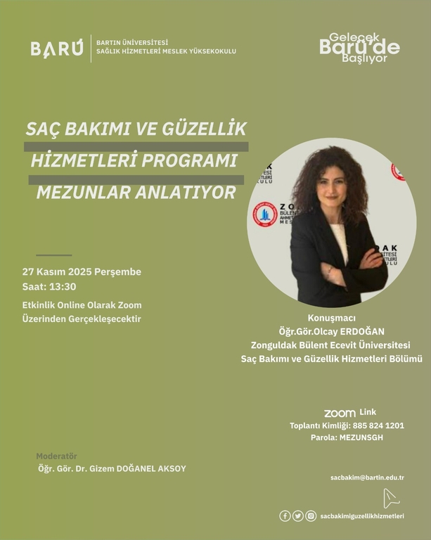 Bartın Üniversitesi Sağlık Hizmetleri Meslek Yüksekokulu Saç Bakımı ve Güzellik Hizmetleri Programı tarafından 27 Kasım 2025 Perşembe günü saat 13.30’da çevrim içi olarak Zoom platformu üzerinden gerçekleştirilecek olan “Mezunlar Anlatıyor” etkinliği kapsamında, Zonguldak Bülent Ecevit Üniversitesi Saç Bakımı ve Güzellik Hizmetleri Bölümü’nden Öğr. Gör. Olcay Erdoğan deneyimlerini paylaşacaktır; tüm öğrencilerimiz ve mezunlarımız etkinliğe davetlidir.